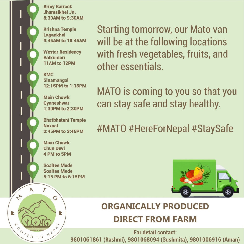 अब आइतबारदेखि पुनः भ्यानबाट तरकारी तथा फलफूल बेचिने गोल्यान समूहका अध्यक्ष पवन गोल्यानले जानकारी दिए। माटो ब्रान्ड गोल्यान समूहको हो।गोल्यानका अनुसार साविकमा भ्यान राखेर बेचिँदै आएको झम्सिखेल चोकका साथै लगनखेल कृष्ण मन्दिर, बालकुमारीको वेस्टार रेसिडेन्सि, सिनामंगल केएमसी, ज्ञानेश्वर चोक, नक्साल भाटभटेनी, चुनदेवी र सोल्टीमोडमा तरकारी तथा फलफूल बिक्री हुनेछ। हेर्नुस् कुन समयमा कहाँ पाइन्छः